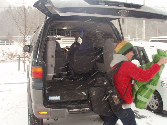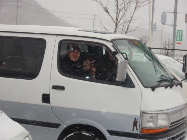 爆弾低気圧により、今回もジャングルに不安を感じつつ、一路東根へ。作並辺りから、路面は積雪。そして突然の突風により視界も奪われ、車の運転も困難に。