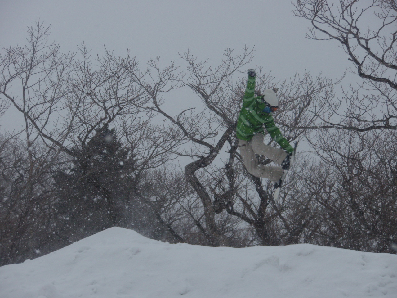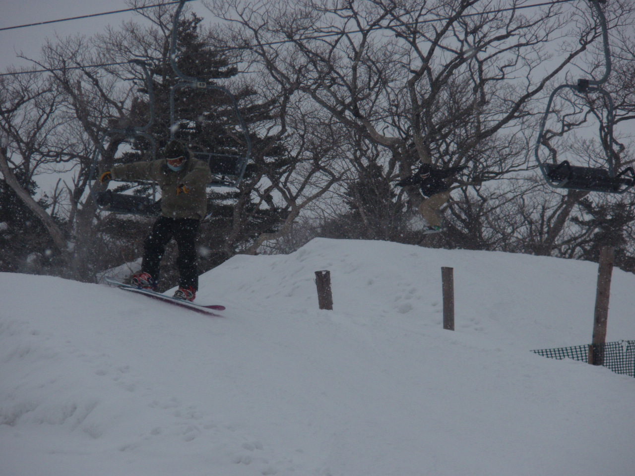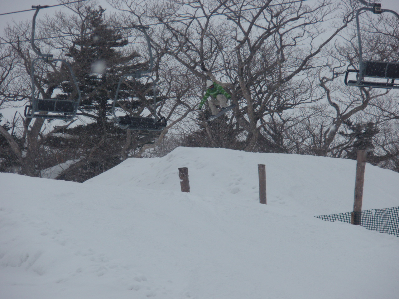 パークは積雪多すぎでクローズだわ散々でした。でも午前中は比較的滑れたので、そこが俺らの底力、遊べるとこ探しに探して、それなりの満足感でした。ネット越えのパウ着、サイコーです。